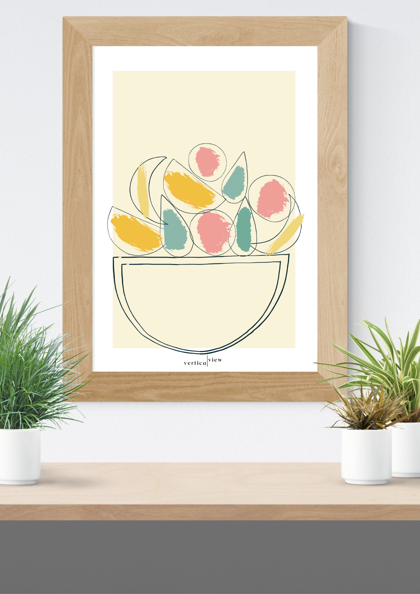 Smuk grafisk plakat med frugtskål, der er perfekt som vægdekoration både i køkkenet, stuen og gangen. De afdæmpede farver på plakaten og det simple motiv gør det nemt at kombinere plakaten med andre for at skabe en unik og personlig billedvæg.